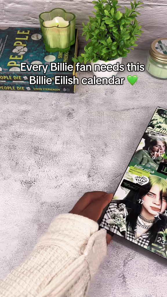 The blue Billie Eilish advent calendar is currently out of stock, but the green version has all the same items inside — only the color of the box is different!